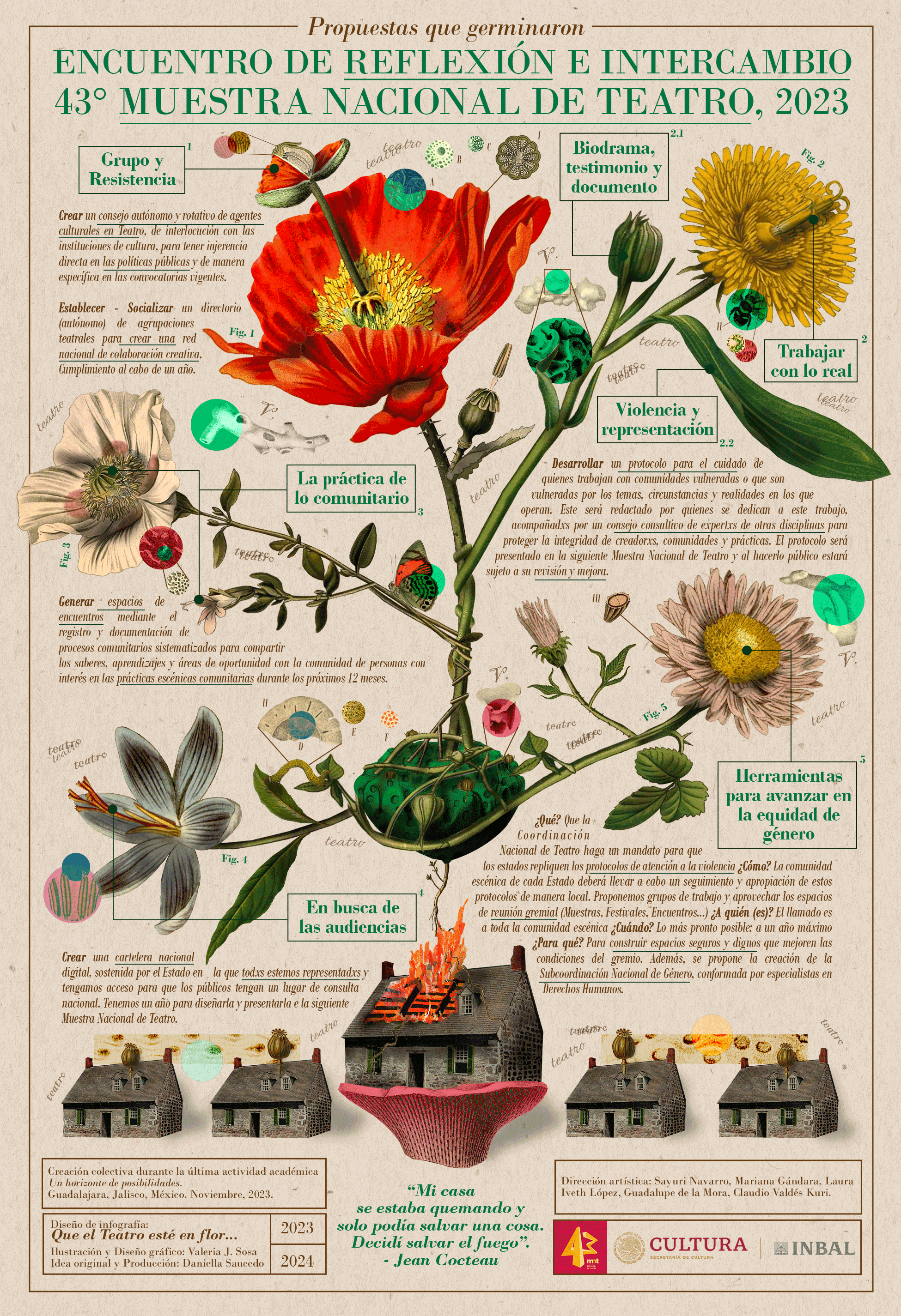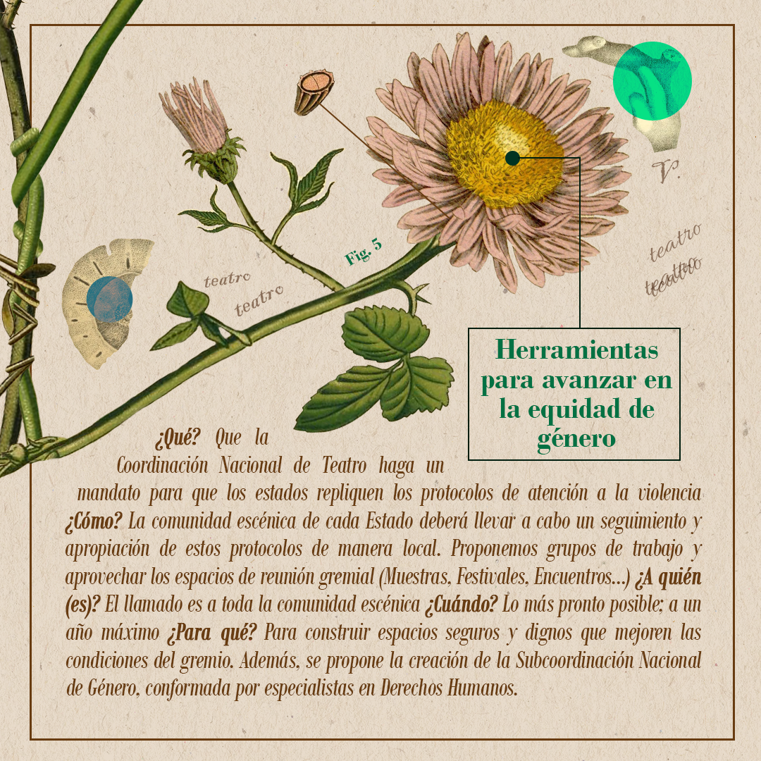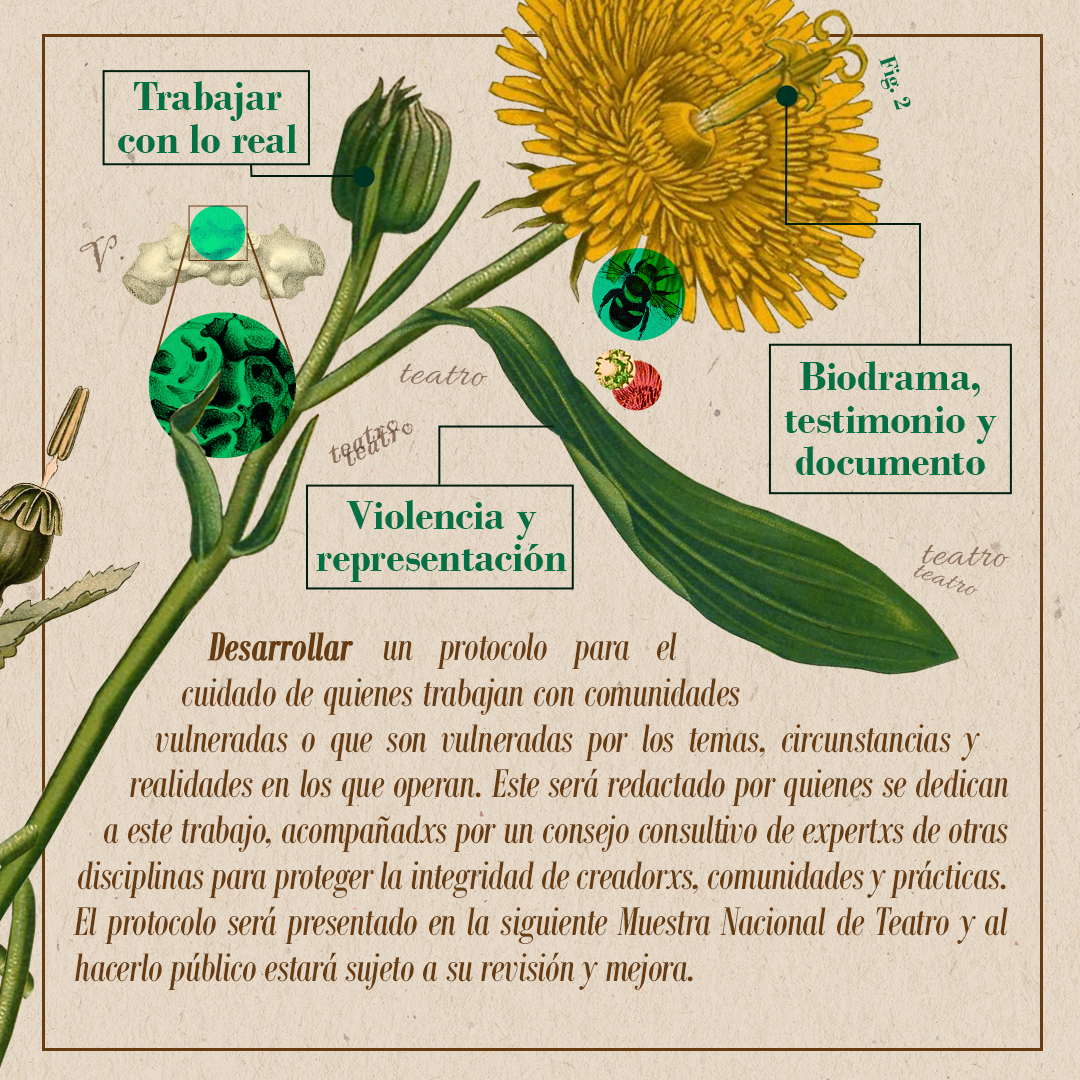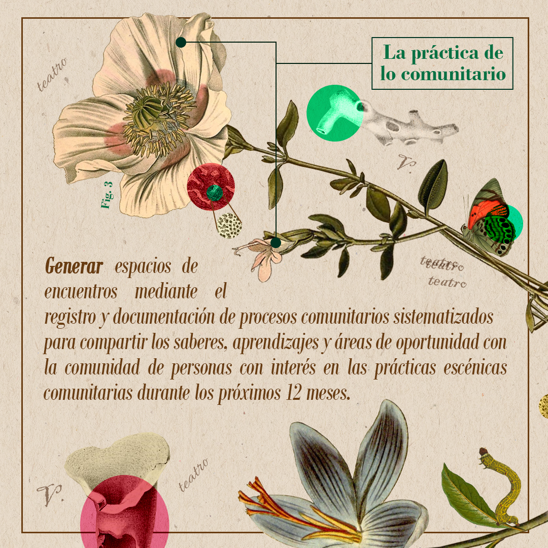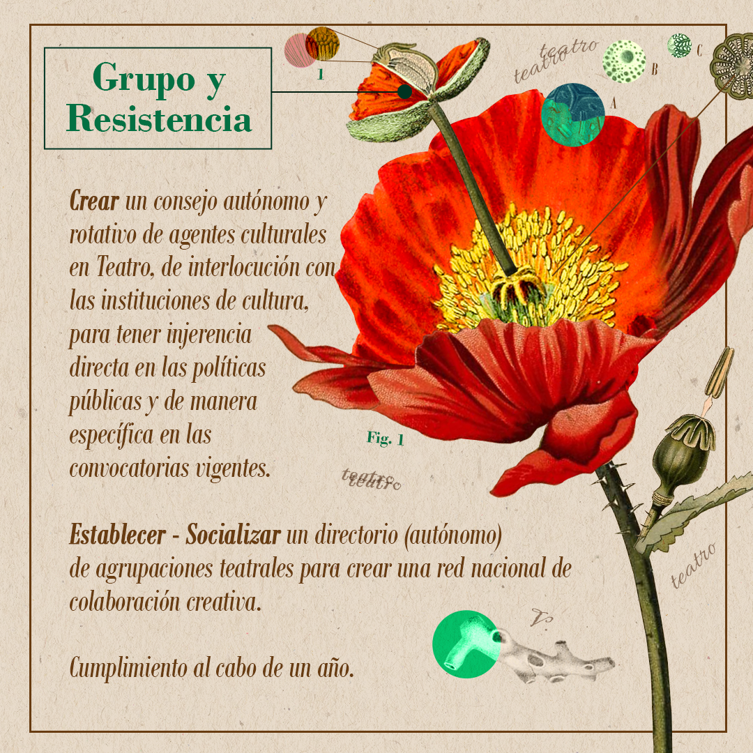 Esta infografía fue creada como retribución al programa y expone las propuestas que decantaron en colectivo del Encuentro de Reflexión e Intercambio. Es también un llamado a la comunidad nacional a unir acciones por el bienestar del teatro y tiene como intereses propulsar dichas ideas en foros gremiales, la divulgación académica del teatro, motivar la figura de la artista investigadora y promover la documentación teatral.